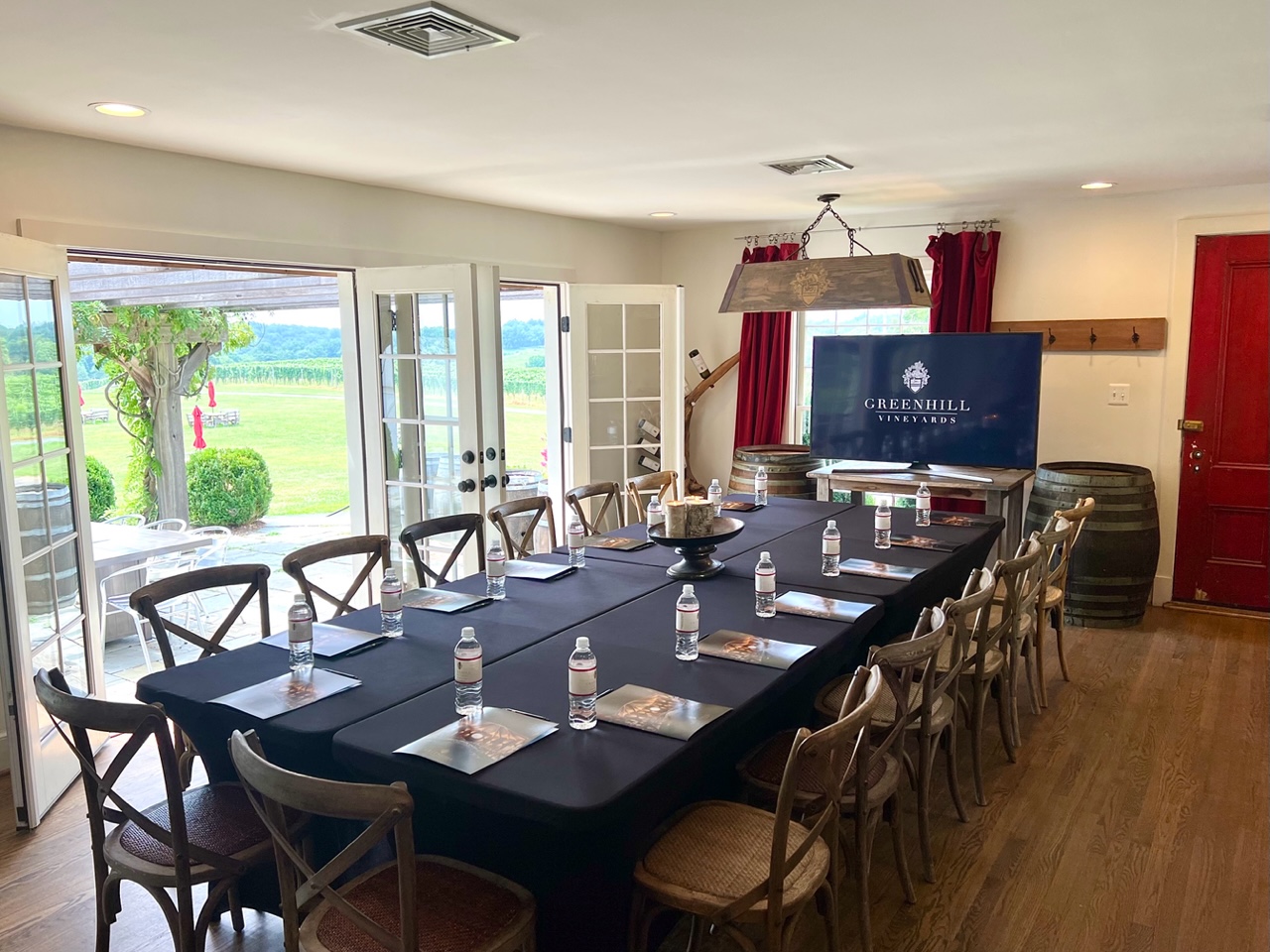 With panoramic views over our spacious lawn to our vineyard, the Conference Room provides a stunning backdrop to any corporate meeting or small gathering. Perfect for executive retreats, offsites, and client meetings, the Conference Room is furnished with an oversized conference table and 60” flat screen television.