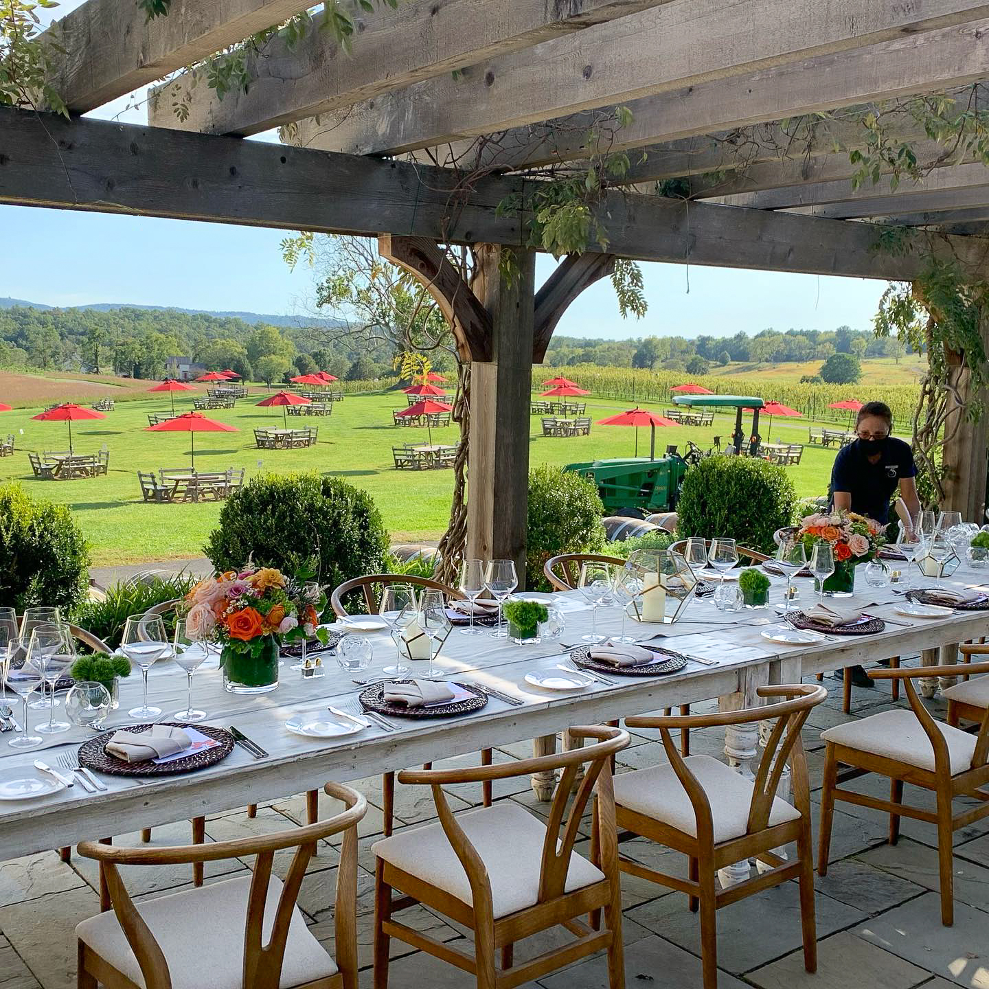 Serving as the first tasting room on the property, the Mini Bar, with its wall-to-wall French doors, affords guests the opportunity to host events with a true indoor/outdoor atmosphere. Flexible in its arrangement, the Mini Bar has hosted a variety of gatherings, from corporate presentations and trainings, to showers and celebrations. With a dedicated terrace and pergola, the Mini Bar’s versatility allows guests to enjoy the beautiful vistas of the Blue Ridge Mountains from a private vantage while having a refuge from any inclement weather.